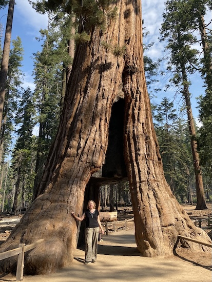 Kirjoittaja Iiris Kivimäki jättiläispunapuun juurella.